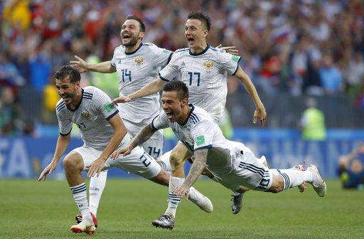 Russia's Fyodor Smolov, right, dives as he celebrates with teammates after Russia defeated Spain in a penalty shoot out during the round of 16 match between Spain and Russia at the 2018 soccer World Cup at the Luzhniki Stadium in Moscow, Russia, Sunday, July 1, 2018. (AP Photo/Manu Fernandez)
