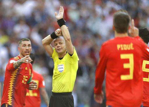 Referee Bjorn Kuipers from Netherlands indicates a handball by Spain's Gerard Pique, front, during the round of 16 match between Spain and Russia at the 2018 soccer World Cup at the Luzhniki Stadium in Moscow, Russia, Sunday, July 1, 2018. (AP Photo/Matthias Schrader)