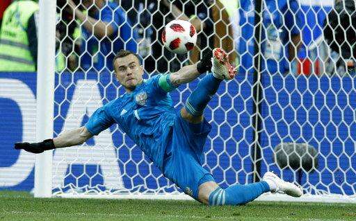 Russia goalkeeper Igor Akinfeev catches a penalty shot during the round of 16 match between Spain and Russia at the 2018 soccer World Cup at the Luzhniki Stadium in Moscow, Russia, Sunday, July 1, 2018. (AP Photo/Victor R. Caivano)