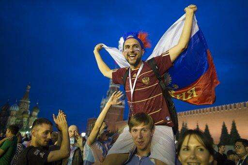 Russia soccer fans celebrate their team victory against Spain in Red Square after the round of 16 match between Spain and Russia at the 2018 soccer World Cup at the Luzhniki Stadium in Moscow, Russia, Sunday, July 1, 2018. Russia shocks Spain at the World Cup, beating the 2010 champion 4-3 in a penalty shootout after a 1-1 draw. (AP Photo/Alexander Zemlianichenko)