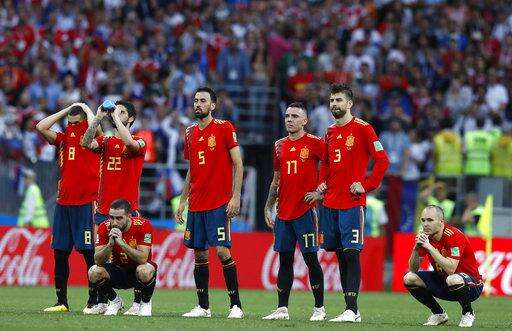 Spain's Andres Iniesta, right, watches with teammates after Spain were defeated in a penalty shoot out by Russia in the round of 16 match between Spain and Russia at the 2018 soccer World Cup at the Luzhniki Stadium in Moscow, Russia, Sunday, July 1, 2018. (AP Photo/Manu Fernandez)