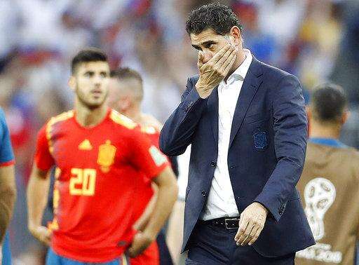 Spain head coach Fernando Hierro reacts after his team lost by penalty shootout during the round of 16 match between Spain and Russia at the 2018 soccer World Cup at the Luzhniki Stadium in Moscow, Russia, Sunday, July 1, 2018. (AP Photo/Antonio Calanni)