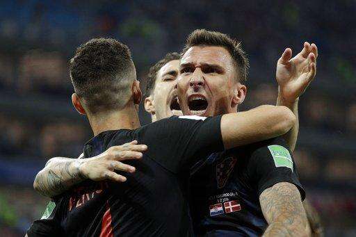 Croatia's Mario Mandzukic, right, celebrates with his teammates after scoring the opening goal of his team during the round of 16 match between Croatia and Denmark at the 2018 soccer World Cup in the Nizhny Novgorod Stadium, in Nizhny Novgorod, Russia, Saturday, July 1, 2018. (AP Photo/Gregorio Borgia)