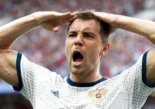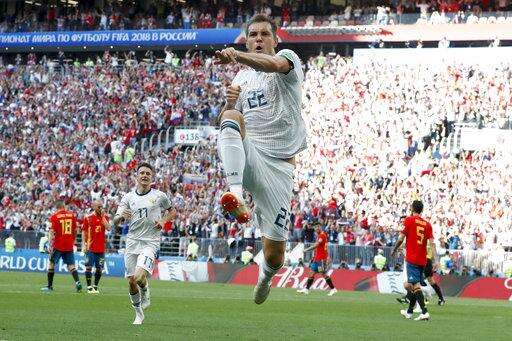 Russia's Artyom Dzyuba celebrates scoring his side's opening goal during the round of 16 match between Spain and Russia at the 2018 soccer World Cup at the Luzhniki Stadium in Moscow, Russia, Sunday, July 1, 2018. (AP Photo/Antonio Calanni)