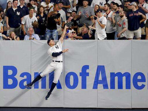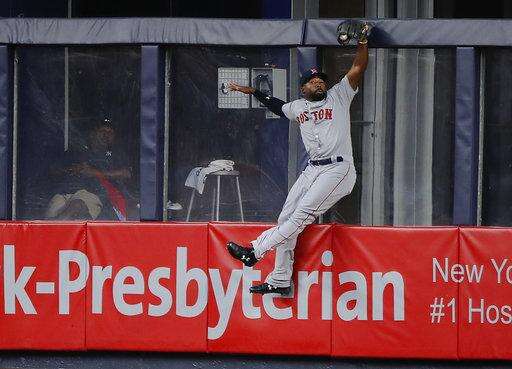 Red Sox center fielder Jackie Bradley Jr. caught Aaron Hicks' drive in the third while leaping and slamming into the wall in front of New York's bullpen.