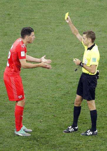 Referee Clement Turpin shows a yellow card to Switzerland's Fabian Schaer during the group E match between Switzerland and Costa Rica, at the 2018 soccer World Cup in the Nizhny Novgorod Stadium in Nizhny Novgorod , Russia, Wednesday, June 27, 2018. (AP Photo/Mark Baker) The Associated Press
