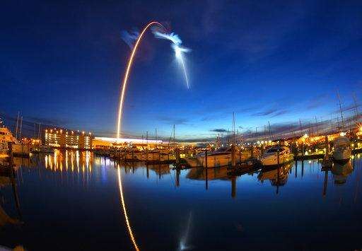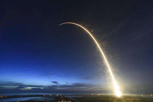 A SpaceX Falcon 9 rocket's exhaust plume is illuminated during a launch just before dawn Friday, June 29, 2018 at Launch Complex 40 at Cape Canaveral, Fla. The used Falcon rocket blasted off before dawn, hauling nearly 6,000 pounds (2,700 kilograms) of cargo, including the spherical AI bot named Cimon; genetically identical mice, or mousetronauts; and super-caffeinated coffee for the crew of the International Space Station. The shipment, packed into a Dragon capsule that's also recycled, should reach the station Monday. (Malcolm Denemark/Orlando Sentinel via AP) The Associated Press