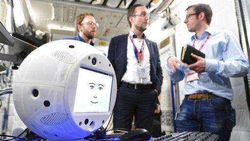 This Jan. 30, 2018 photo provided by the German Aerospace Center shows the "Cimon" (Crew Interactive MObile companioN) robot during a communications test at the ESA European Astronaut Center in Cologne-Porz, Germany. The round, artificial intelligence robot is part of SpaceX's latest delivery to the International Space Station. Liftoff is set for early Friday, June 29, 2018, from Cape Canaveral, Fla. In the background from left are project leaders Christian Karrasch, Till Eisenberg and Christoph Kossl. (T. Bourry/ESA/DLR via AP) The Associated Press