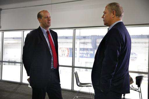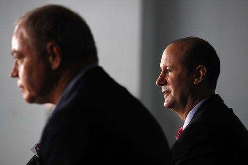 Washington Capitals Senior Vice President and General Manager Brian MacLellan, left, and newly named head coach Todd Reirden attend a news conference about the appointment of Reirden as the new NHL hockey team's coach, in Arlington, Va., Tuesday, July 3, 2018. (AP Photo/Jacquelyn Martin) The Associated Press