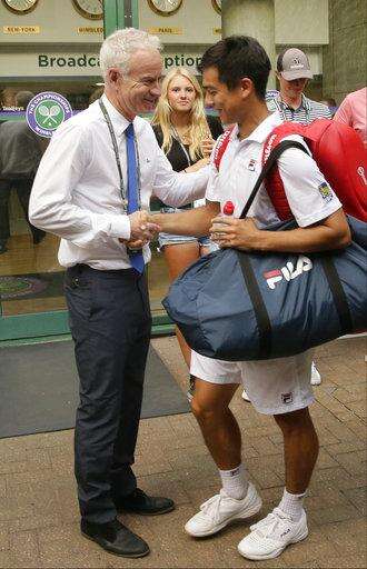 Mackenzie McDonald of the US is congratulatedby former Wimbledon champion John McEnroe after defeating Guido Pella of Argentina in their men's singles match on the fifth day at the Wimbledon Tennis Championships in London, Friday July 6, 2018. (AP Photo/Tim Ireland) The Associated Press