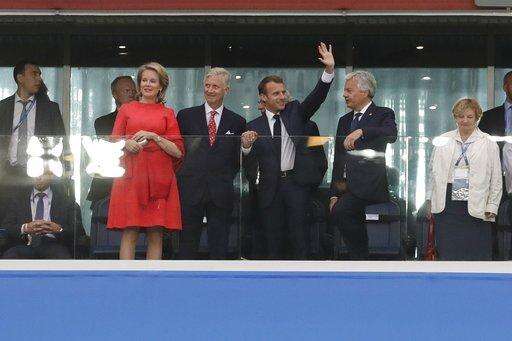 France President Emmanuel Macron is attending the World Cup semifinal between France and Belgium at St. Petersburg Stadium. Macron shook hands with King Philippe of Belgium, who was with his wife Queen Mathilde.