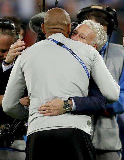 France coach Didier Deschamps warmly hugged Thierry Henry moments before the start. Henry is France's all-time leading scorer with 51 goals, but is now an assistant to Belgium coach Robert Martinez. Henry also greeted players on France's bench.