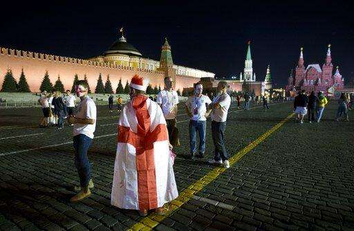 England fans stand in Red Square after the semifinal soccer match between Croatia and England during the 2018 soccer World Cup in Moscow, Russia, Thursday, July 12, 2018. (AP Photo/Alexander Zemlianichenko) The Associated Press