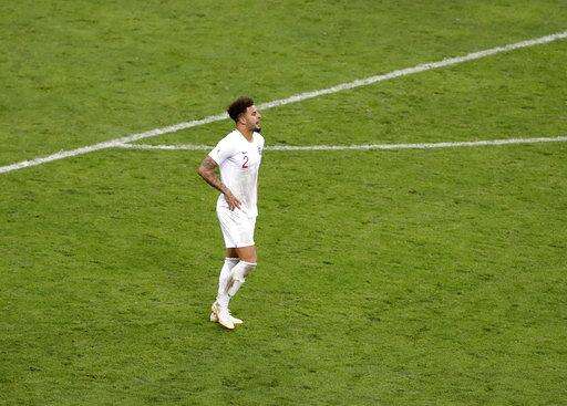 England's Kyle Walker reacts after Croatia's Mario Mandzukic scoring his side's second goal during the semifinal match between Croatia and England at the 2018 soccer World Cup in the Luzhniki Stadium in Moscow, Russia, Wednesday, July 11, 2018. (AP Photo/Darko Bandic) The Associated Press