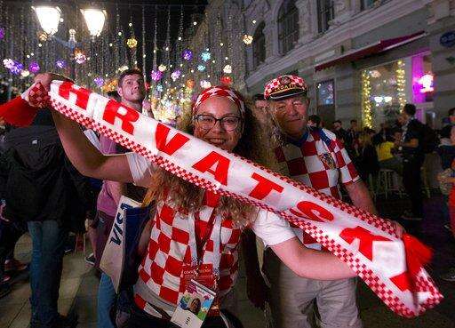Croatia fans celebrate their team victory after the semifinal soccer match between Croatia and England during the 2018 soccer World Cup in Nikolskaya street near the Kremlin in Moscow, Russia, Thursday, July 12, 2018. (AP Photo/Alexander Zemlianichenko) The Associated Press