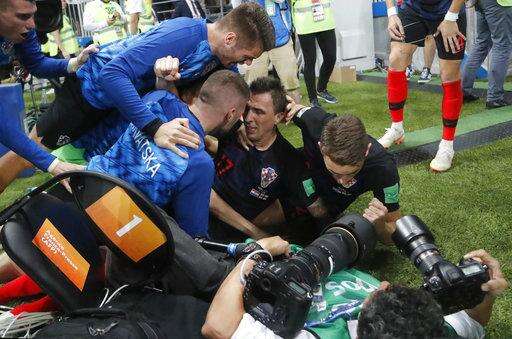 Croatia's Mario Mandzukic, sits on the ground after he fell over a photographer when celebrating his side's second goal during the semifinal match between Croatia and England at the 2018 soccer World Cup in the Luzhniki Stadium in Moscow, Russia, Wednesday, July 11, 2018. (AP Photo/Frank Augstein) The Associated Press