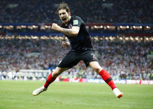 Croatia's Sime Vrsaljko celebrates after his team advanced to the final during the semifinal match between Croatia and England at the 2018 soccer World Cup in the Luzhniki Stadium in Moscow, Russia, Wednesday, July 11, 2018. (AP Photo/Alastair Grant) The Associated Press