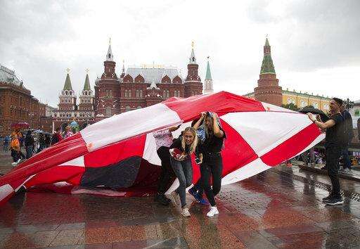 Soccer fans use a giant Croatian national flag as a shelter during the rain at Manezh Square near Red Square ahead of the semifinal soccer match between Croatia and England during the 2018 soccer World Cup at the Luzhniki stadium in Moscow, Russia, Wednesday, July 11, 2018. (AP Photo/Alexander Zemlianichenko) The Associated Press
