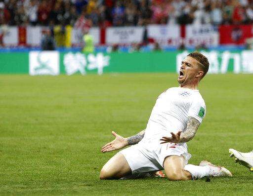 England's Kieran Trippier celebrates after scoring the opening goal during the semifinal match between Croatia and England at the 2018 soccer World Cup in the Luzhniki Stadium in Moscow, Russia, Wednesday, July 11, 2018. (AP Photo/Francisco Seco) The Associated Press