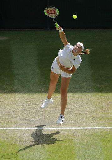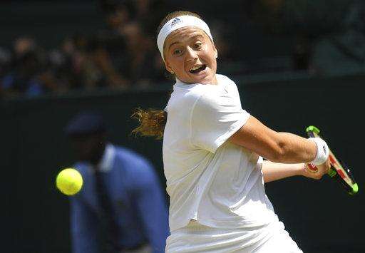 Jelena Ostapenko of Latvia returns the ball to Angelique Kerber of Germany during their women's semifinal match at the Wimbledon Tennis Championships in London, Thursday July 12, 2018. (Neil Hall/Pool via AP) The Associated Press