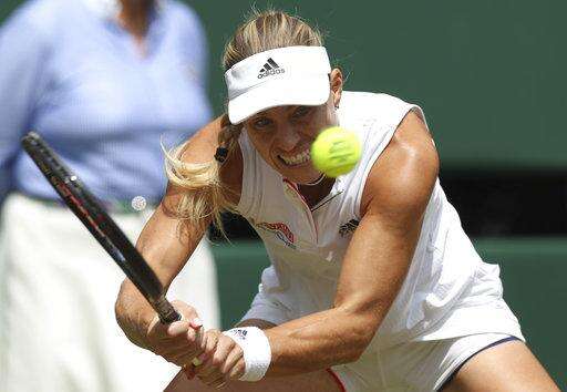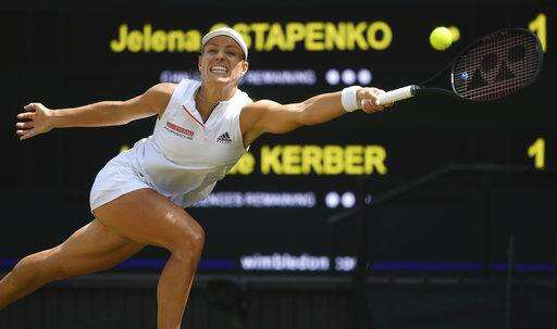 Angelique Kerber of Germany returns the ball to Jelena Ostapenko of Latvia during their women's semifinal match at the Wimbledon Tennis Championships in London, Thursday July 12, 2018. (Neil Hall/Pool via AP) The Associated Press