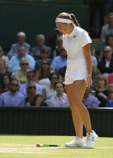 Latvia's Jelena Ostapenko reacts after losing a point to Germany's Angelique Kerber during their women's singles semifinals match at the Wimbledon Tennis Championships, in London, Thursday July 12, 2018. (AP Photo/Tim Ireland) The Associated Press