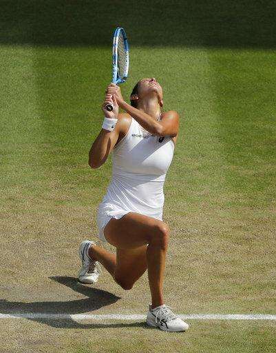 Germany's Angelique Kerber celebrates defeating Latvia's Jelena Ostapenko during their women's singles semifinals match at the Wimbledon Tennis Championships, in London, Thursday July 12, 2018. (AP Photo/Kirsty Wigglesworth) The Associated Press