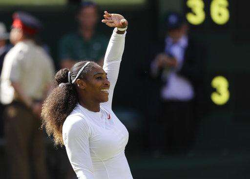 Serena Williams of the United States celebrates winning her women's singles quarterfinals match against Italy's Camila Giorgi, at the Wimbledon Tennis Championships, in London, Tuesday July 10, 2018. (AP Photo/Kirsty Wigglesworth) The Associated Press