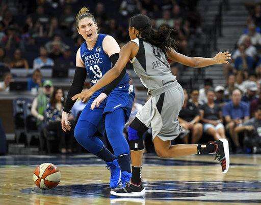 Las Vegas Aces forward Tamera Young (1) is fouled by Minnesota Lynx center Sylvia Fowles (34) during a layup attempt during the second half of a WNBA basketball game Friday, July 13, 2018, in Minneapolis. (Aaron Lavinsky/Star Tribune via AP)