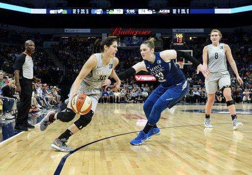Las Vegas Aces guard Kelsey Plum drives against Minnesota Lynx guard Lindsay Whalen (13) during the second half of a WNBA basketball game Friday, July 13, 2018, in Minneapolis. (Aaron Lavinsky/Star Tribune via AP)