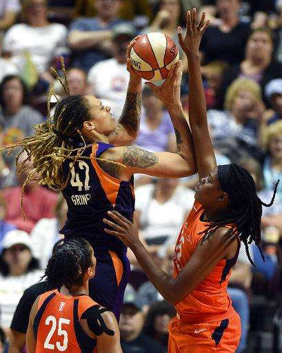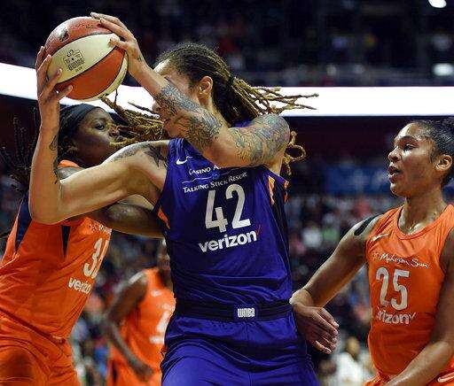 Phoenix Mercury center Brittney Griner (42) fends off Connecticut Sun defenders Jonquel Jones, left, and Alyssa Thomas (25) during the second half of a WNBA basketball game Friday, July 13, 2018, in Uncasville, Conn. (Sean D. Elliot/The Day via AP)
