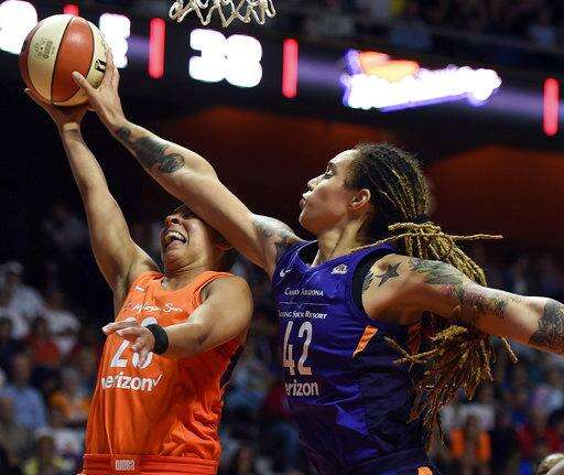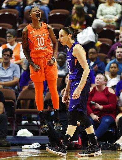 Connecticut Sun guard Jasmine Thomas runs into a screen from Phoenix Mercury forward Angel Robinson (0) while pursuing Diana Taurasi (3) during the first half of a WNBA basketball game Friday, July 13, 2018, in Uncasville, Conn. (Sean D. Elliot/The Day via AP)