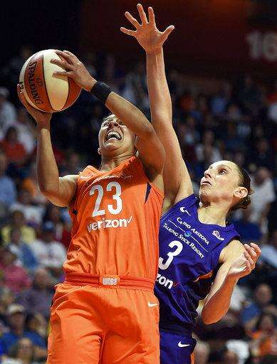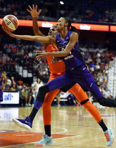 Phoenix Mercury forward DeWanna Bonner drives to the basket around Connecticut Sun center Jonquel Jones during the second half of a WNBA basketball game Friday, July 13, 2018, in Uncasville, Conn. (Sean D. Elliot/The Day via AP)