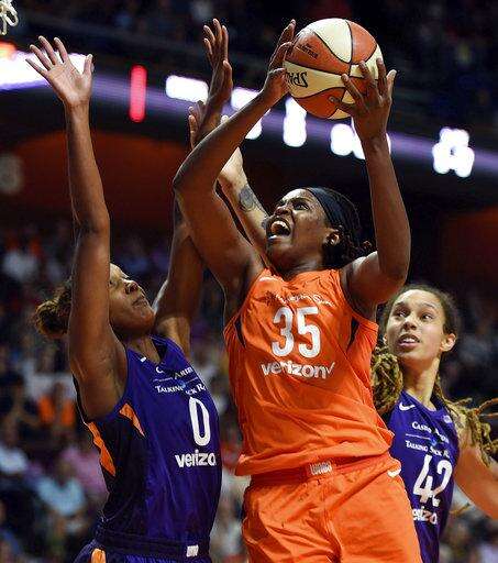 Connecticut Sun center Jonquel Jones (35) battles Phoenix Mercury defenders Angel Robinson (0) and Brittney Griner (42) in the first half of WNBA basketball game action Friday, July 13, 2018, in Uncasville, Conn. (Sean D. Elliot/The Day via AP)