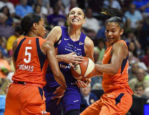Connecticut Sun guard Jasmine Thomas (5) picks up the foul as she and teammate Alyssa Thomas, right, defend against Phoenix Mercury guard Diana Taurasi during the second half of a WNBA basketball game Friday, July 13, 2018, in Uncasville, Conn. (Sean D. Elliot/The Day via AP)