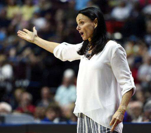 Phoenix Mercury coach Sandy Brondello questions the officials during the second half of a WNBA basketball game against the Connecticut Sun on Friday, July 13, 2018, in Uncasville, Conn.. (Sean D. Elliot/The Day via AP)