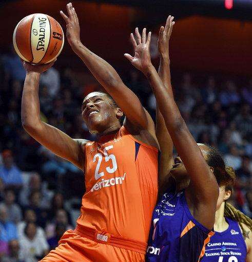 Connecticut Sun forward Alyssa Thaoms (25) shoots over Phoenix Mercury forward Angel Robinson in the first half of WNBA basketball game action Friday, July 13, 2018, in Uncasville, Conn. (Sean D. Elliot/The Day via AP)