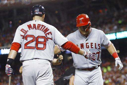 Los Angeles Angels of Anaheim outfielder Mike Trout (27) is welcomed at the dugout by Boston Red Sox's J.D. Martinez (28) after his solo home run during the third inning of the Major League Baseball All-Star Game, Tuesday, July 17, 2018, in Washington. (AP Photo/Patrick Semansky) The Associated Press