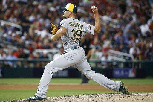 Oakland A's pitcher Blake Treinen (39) throws during the sixth inning at the Major League Baseball All-star Game, Tuesday, July 17, 2018 in Washington. (AP Photo/Alex Brandon) The Associated Press