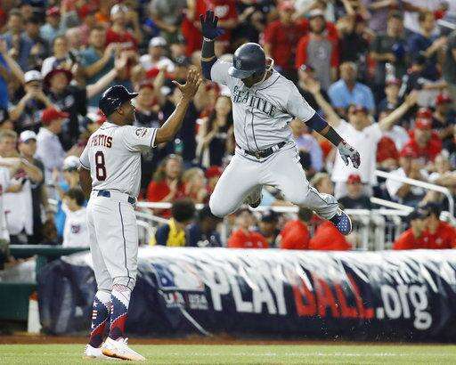 Seattle Mariners shortstop Jean Segura (2) celebrates his three-run homer in the eighth inning during the Major League Baseball All-star Game, Tuesday, July 17, 2018 in Washington. (AP Photo/Alex Brandon) The Associated Press