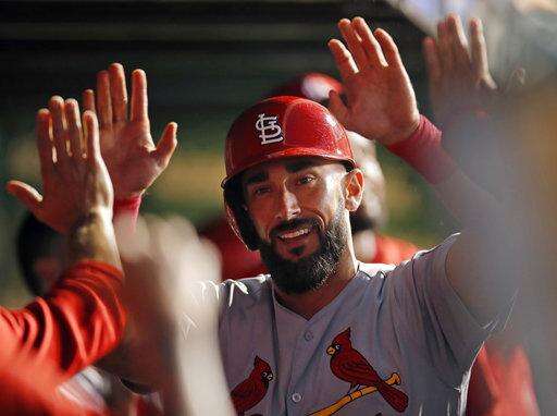 St. Louis Cardinals' Matt Carpenter is congratulated after hitting a home run during the seventh inning of the second baseball game of a doubleheader against the Chicago Cubs on Saturday, July 21, 2018, in Chicago. (AP Photo/Jim Young) The Associated Press