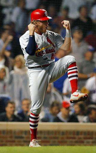 St. Louis Cardinals' Harrison Bader celebrates after scoring a run against the Chicago Cubs during the ninth inning of the second baseball game of a doubleheader Saturday, July 21, 2018, in Chicago. (AP Photo/Jim Young) The Associated Press