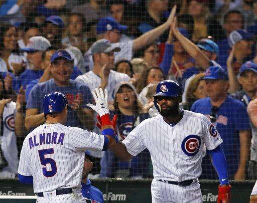 Chicago Cubs' Albert Almora Jr., left, celebrates with teammate Jason Heyward after Almora scored during the sixth inning of the second baseball game of a doubleheader against the St. Louis Cardinals. on Saturday, July 21, 2018, in Chicago. (AP Photo/Jim Young) The Associated Press