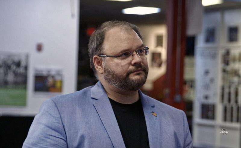 This image released by Showtime shows Jason Spencer in a scene from the series "Who Is America," starring Sacha Baron Cohen. In the episode featuring Spencer, Cohen poses as an Israeli military expert who persuades Spencer to take part in several outlandish exercises. (Showtime via AP)