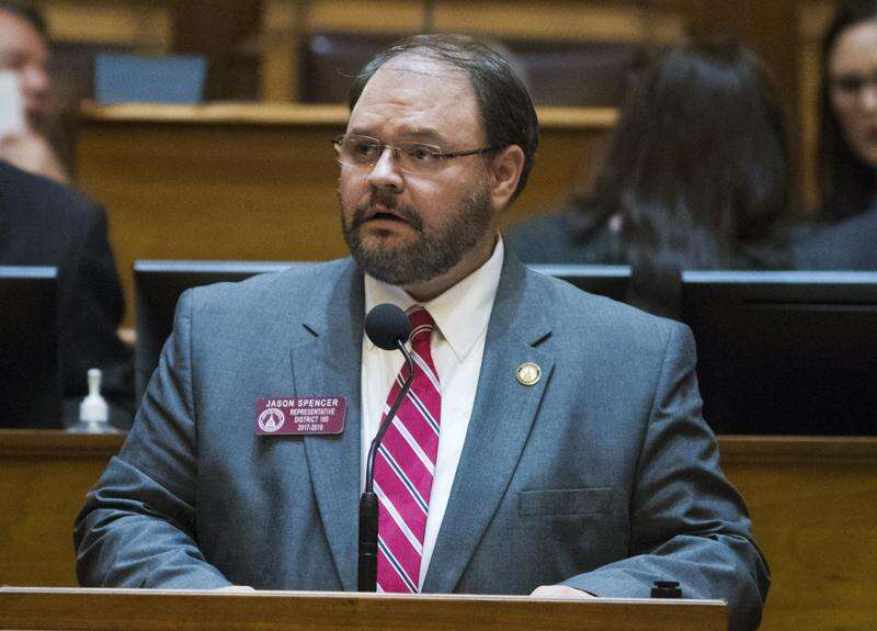 In this Feb. 28, 2018 photo, Rep. Jason Spencer, of Woodbine, speaks at the Georgia State Capitol in Atlanta. Spencer is seen using racial slurs and dropping his pants in an episode of Sacha Baron Cohen's Showtime series "Who Is America?".In the Sunday, July 22, broadcast, Spencer repeatedly uses a racial slur for African Americans and later exposes his bottom after being told it helps scare away Muslim terrorists. (Alyssa Pointer/Atlanta Journal-Constitution via AP)