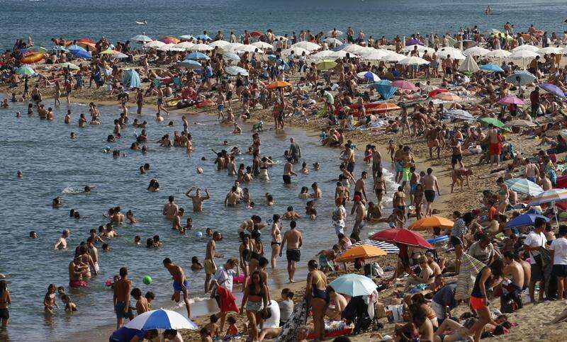People sunbathe on a beach in Barcelona, Spain, Wednesday, Aug. 1, 2018. Much of Spain is on alert as the country's weather agency warns that temperatures could surpass 40 degrees Celsius (104 Fahrenheit) due to a hot air mass moving northward from the African continent. (AP Photo/Manu Fernandez)