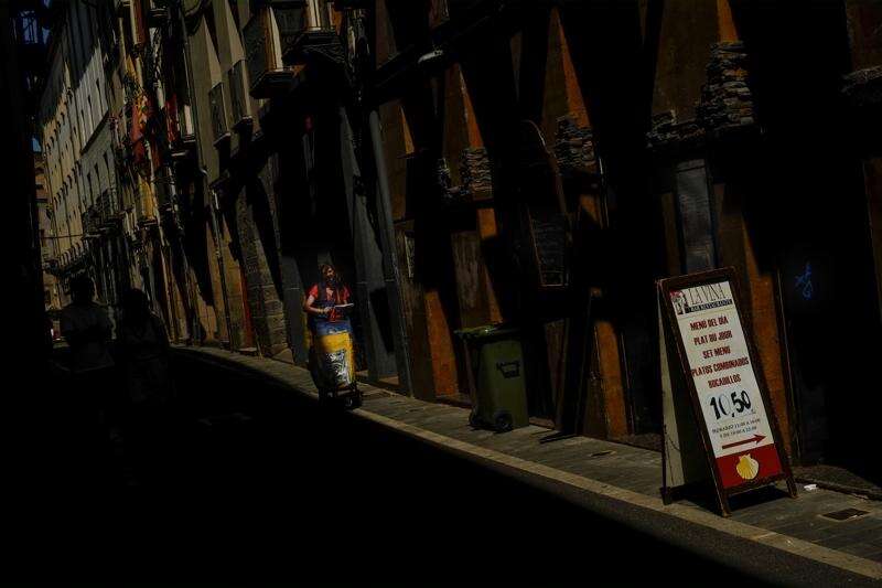 A worker of Spanish Post Office walks past between the shadow and sun light while checking an a street address of the old city during a hot summer day, in Pamplona, northern Spain, Thursday, Aug. 2, 2018. Much of Spain is on alert as the country's weather agency warns that temperatures could surpass more than 40 degrees Celsius (104 Fahrenheit) due to a hot air mass moving northward from the African continent. (AP Photo/Alvaro Barrientos)