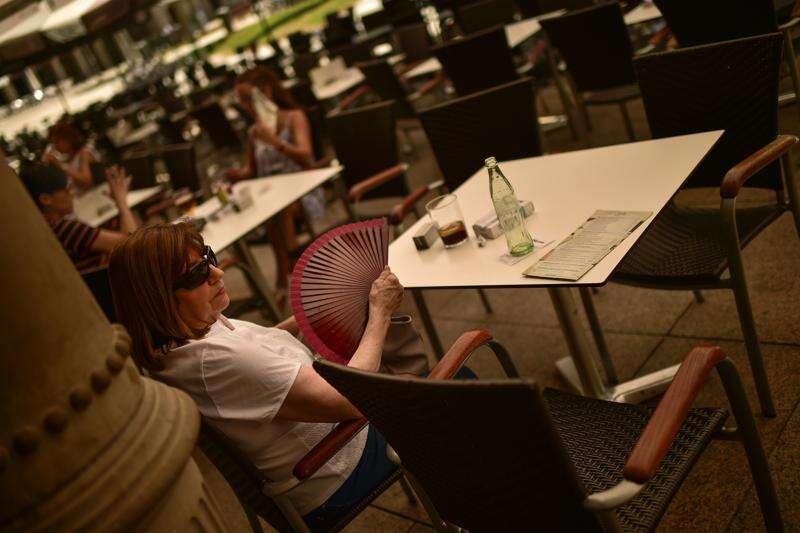 A woman seated at a bar cools off with a fan during a hot summer day, in Pamplona, northern Spain, Thursday, Aug. 2, 2018. Much of Spain is on alert as the country's weather agency warns that temperatures could surpass more than 40 degrees Celsius (104 Fahrenheit) due to a hot air mass moving northward from the African continent. (AP Photo/Alvaro Barrientos)