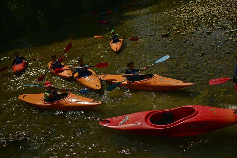 EDS NOTE : SPANISH LAW REQUIRES THAT THE FACES OF MINORS ARE MASKED IN PUBLICATIONS WITHIN SPAIN. People practice rowing in the Arga River during a hot summer day, in Pamplona, northern Spain, Thursday, Aug. 1, 2018.( Much of Spain is on alert as the country's weather agency warns that temperatures could surpass 40 degrees Celsius (104 Fahrenheit) due to a hot air mass moving northward from the African continent. (AP Photo/Alvaro Barrientos)