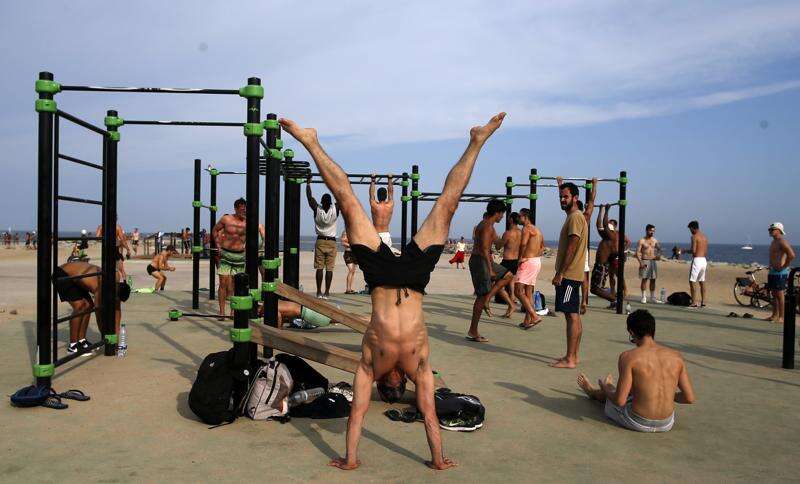 People exercise on a beach in Barcelona, Spain, Wednesday, Aug. 1, 2018. Much of Spain is on alert as the country's weather agency warns that temperatures could surpass 40 degrees Celsius (104 Fahrenheit) due to a hot air mass moving northward from the African continent. (AP Photo/Manu Fernandez)